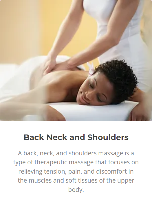 A back, neck, and shoulders massage is a type of therapeutic massage that focuses on relieving tension, pain, and discomfort in the muscles and soft tissues of the upper body.