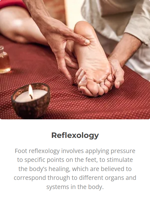 Foot reflexology involves applying pressure to specific points on the feet, to stimulate the body’s healing, which are believed to correspond through to different organs and systems in the body.